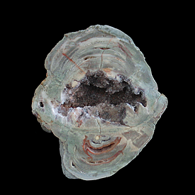 Valley, Oppenau, Oberes Renchtal, Ortenaukreis 8.5 x 8.3 x 3.3 cm A lithophysae agate from Germany's Black Forest. This nodule features green and white agate as well as several vugs filled with quartz crystals. The vugs are outlined by a red-brown hematite.