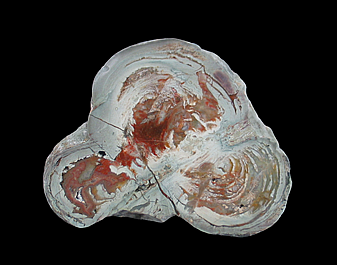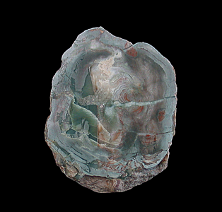 Valley, Oppenau, Oberes Renchtal, Ortenaukreis 15.4 x 12.9 x 4.5 cm A rather large lithophysae agate from Germany's Black Forest. This specimen exhibits several shades of green accented by patches of brick-red hematite. There is also a patch of colorless quartz with a ring of hematite present in the in left-center of the specimen.