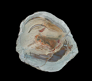 Valley, Oppenau, Oberes Renchtal, Ortenaukreis 7.4 x 7.6 x 3 cm A lithophysae agate from Germany's Black Forest. This specimen exhibits several shades of green with a sand-colored center that is accented by patches of red hematite.