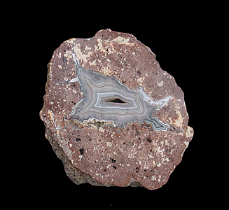 AD-268 Agate with Quartz & Hematite $50 Nowy Kosciól, Gmina Swierzawa, Zlotoryja County, Lower Silesian Voivodeship, Poland 9 x 7.6 x 4.3 cm A lithophysae nodule (thunder egg) from south-western Poland with bands of blue-grey agate accented by spots of dark-red hematite. The center of the agate has small vug filled with tiny quartz crystals.