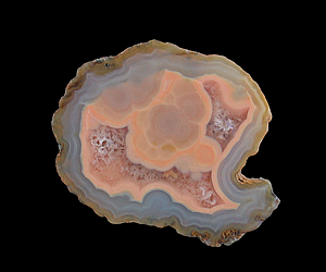 Hauser Beds, Thumb Peak, Palo Verde Mountains, Imperial County, CA 8.5 x 8.2 x 3.4 cm This lithophysae agate from California's Hauser Beds features a brownish-colored center with faintly pinkish highlights. The chalcedony core is surrounded by a thin line of reddish-pink agate as well as several bands of moss-green. Classic, older material that agate & thunder-egg collectors hold in high regard.