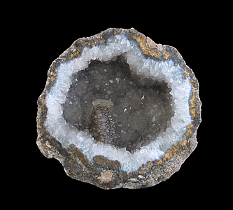 AD-278 Calcite & Quartz geode $85 Las Choyas, Aldama Municipality, Chihuahua, Mexico Dimensions: Left 12.2 x 11.5 x 5.2 cm Right This geode is a good example of what the tuffaceous ash flow at Las Choyas had to offer in its heyday. The vug of this specimen is lined completely with quartz upon which sits a tower-like formation of tabular calcite crystals. The days when you could get a geode of good quality from Las Choyas at any rock shop are long gone. This specimen came from my personal stash of Las Choyas geodes that were purchased from the Law family, who had the geode concession at the San Diego County Fair during the 1980's & 1990's.