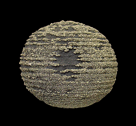 AD-285 Pyrite $100 Dongchuan Cu Ore Field, Dongchuan District, Kunming, Yunnan, China 5.8 x 5 x 4.7 cm This specimen features numerous pyrite crystals that have formed in concentric rings on a spherical nodule of shale. These distinctive & quite singular specimens were found for a short time in the late 2000's.