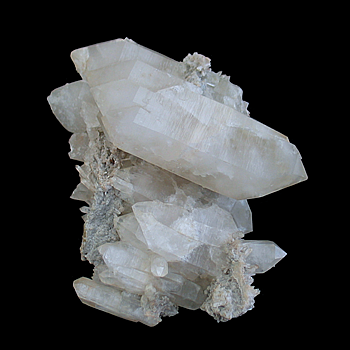 Q-629 Quartz with Cookeite $150 Bennett Quarry, Buckfield, Oxford County, Maine, USA 11.3 x 12.1 x 5.9 cm A large group of doubly terminated quartz crystals exhibiting parallel growth accented by patches of silvery-green cookeite.