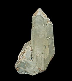 Q-634 Quartz with Stilpnomelane & Chlorite $50 Landsverk 1 Feldspar Quarry, Landsverk, Evje og Hornnes, Agder, Norway 9.8 x 6.7 x 4.4 cm A group of several quartz crystals with a thin coating of chlorite and patches of brownish stilpnomelane.