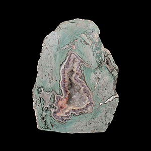 AD-275 Amethyst with Agate $50 Mount Hay, Wycarbah, Rockhampton Region, Queensland, Australia 5.6 x 4.9 x 1.7 cm Rhyolite nodule with deeply-colored amethyst surrounded by a thin band of agate. The greenish color of the rhyolite is most likely due to inclusions of celadonite.