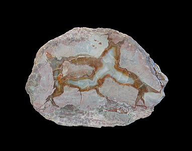 Hauser Beds, Thumb Peak, Palo Verde Mountains, Imperial County, CA 8.5 x 8.2 x 3.4 cm This lithophysae agate from California's Hauser Beds features a brownish-colored center with faintly pinkish highlights. The chalcedony core is surrounded by a thin line of reddish-pink agate as well as several bands of moss-green. Classic, older material that agate & thunder-egg collectors hold in high regard.
